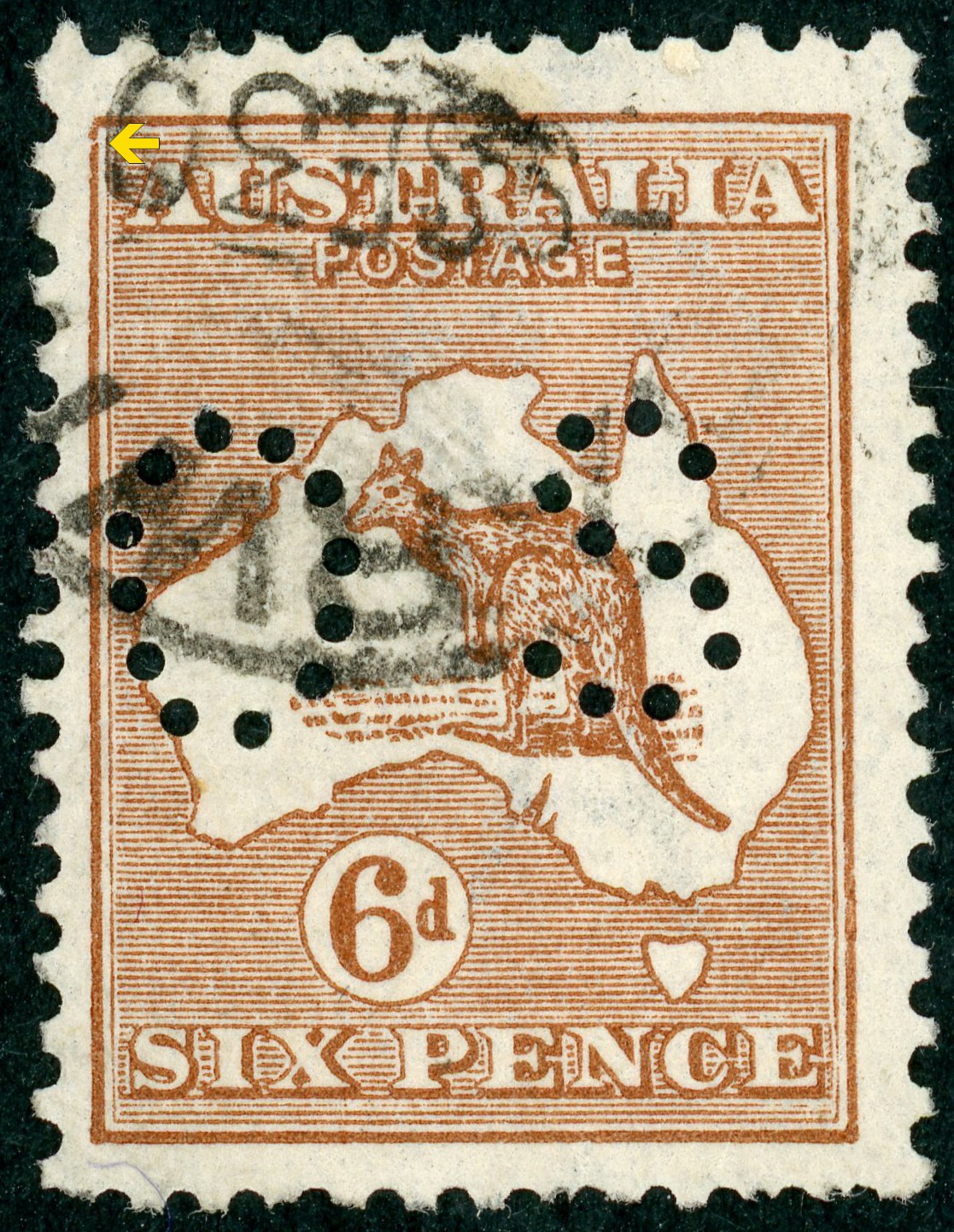 Third watermark (Large Multiple) Die IIB The plate from which this stamp comes has not yet been identified (per ACSC 2017 Catalogue). Stamp has Small OS perfin. Small break in outer frame at top left.
