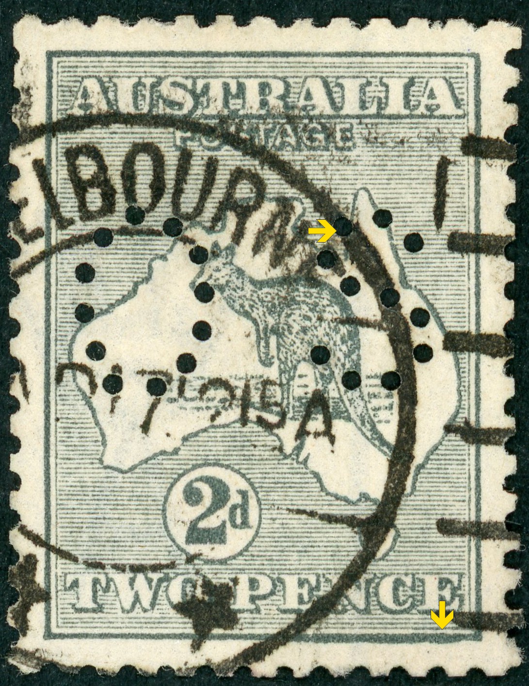 First Watermark This stamp comes frpm Plate 2, Lower pane, Position 6 (2L6). The lower frame is retouched at right corner. There is also a flaw in the Gulf of Carpentaria which is hidden by the postmark.