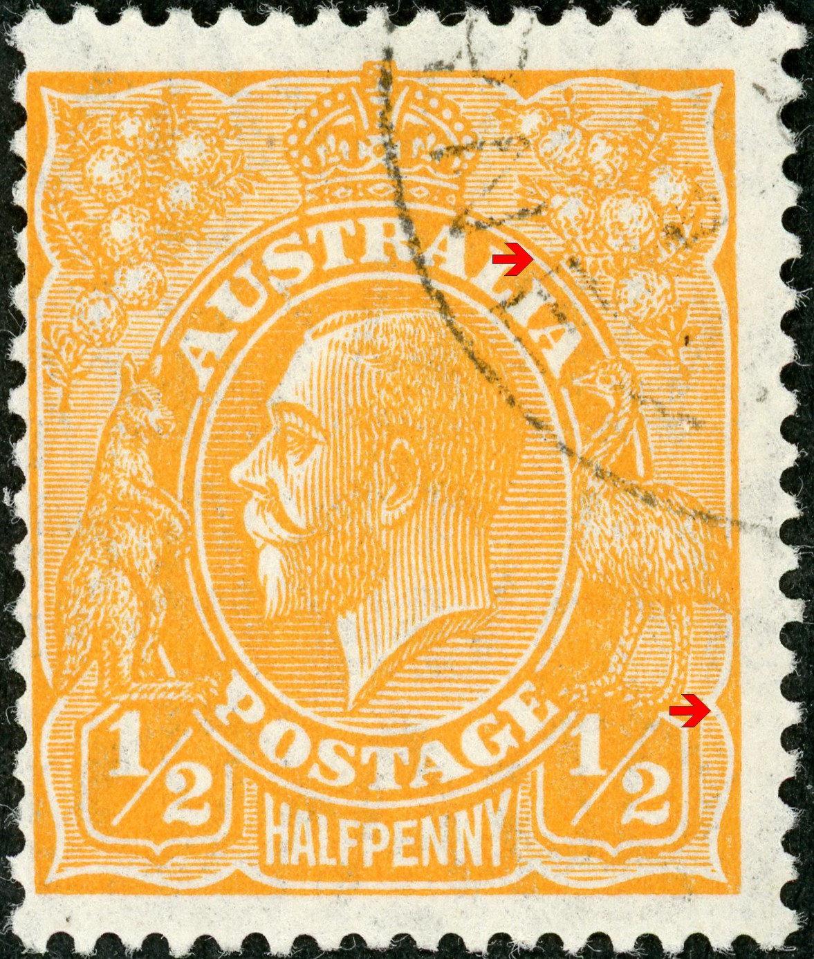 Colour flaw between right wattle and the outer coloured oval, above the "I" of "AUSTALIA"