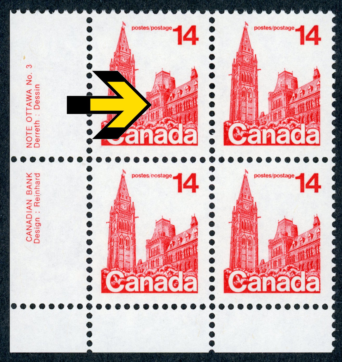 Canada - Unitrade (Scott) 715viii Issued 7 March 1978 "Closed blind" variety Position 81 (Row 8, first stamp) This specimen is the Upper left stamp on an Lower Left Plate Block along with three normal 715 stamps